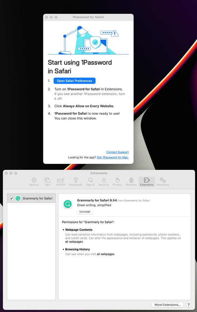 /System/Library/Frameworks/CoreServices.framework/Frameworks/LaunchServices.framework/Support/lsregister -f -R /Applications/Safari.app - Open Safari and try to enable 1Password for Safari again.