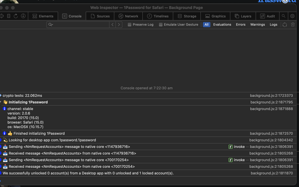 - Choose "Develop > Web Extension Background Pages > 1Password for Safari".
