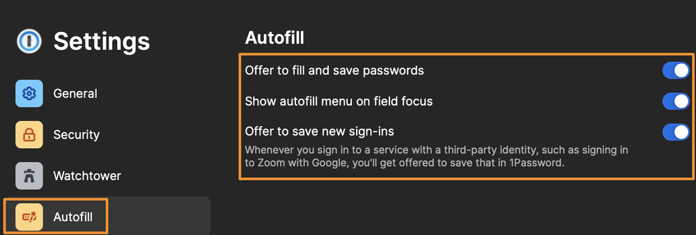 With 1Password 8.9.4 and 1Password for Safari 2.3.8 (Monterey 12.6), I have only the first two Autofill options you do. "Offer to save new sign-ins" is missing.