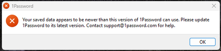 This error usually means there are (or were) two different versions of 1Password on the device. A newer version has created files that an older version can't open. This most often happens when switching from Nightly or Beta back to Production, or when multiple versions of 1Password are installed at the same time.
