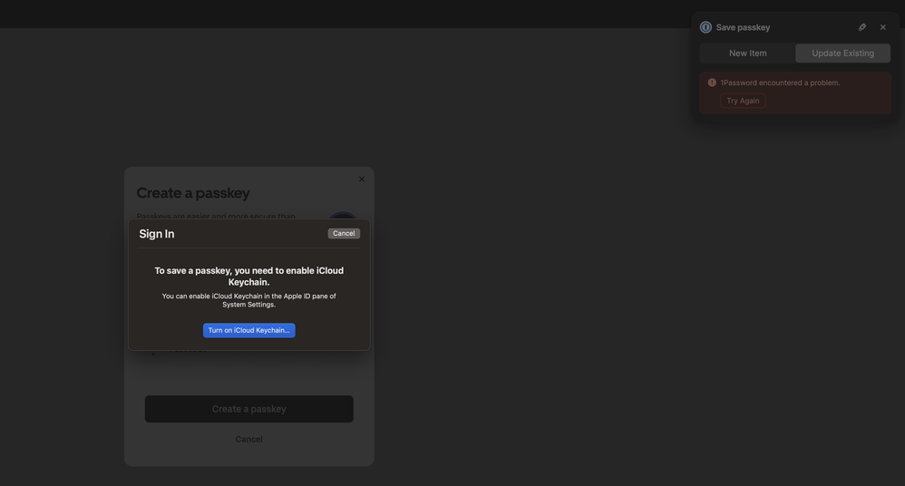 * In the passkey flow, the 1Password modal widget says an error occurred, while a system popup comes up prompting me to turn on iCloud Keychain to save the passkey: