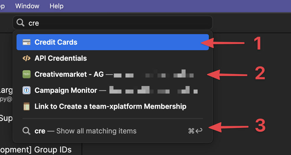 Hi @trevordewitt! The new search works as a combination "quick find" and "full search". In past versions we've found that a lot of folks really just wanted a quicker way to get to their items, to be able to quickly hop to seeing a certain category of items via search like credit cards (number 1 in my screenshot below), or to jump to a specific item wherever it lives (number 2). And not necessarily perform a full search that changes the UI of the app to only show those results in the list view. But a full item search is still very much possible by either clicking on the last row that says "Show all matching items", or just hitting command+enter once you've typed in what you want (shows as number 3 in the screenshot)