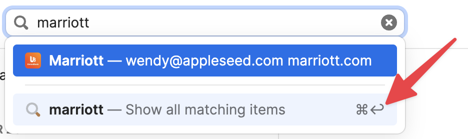 1Password 8 will show you the most relevant result in the search pop-up but you can view all matching results by clicking on Show all matching items: