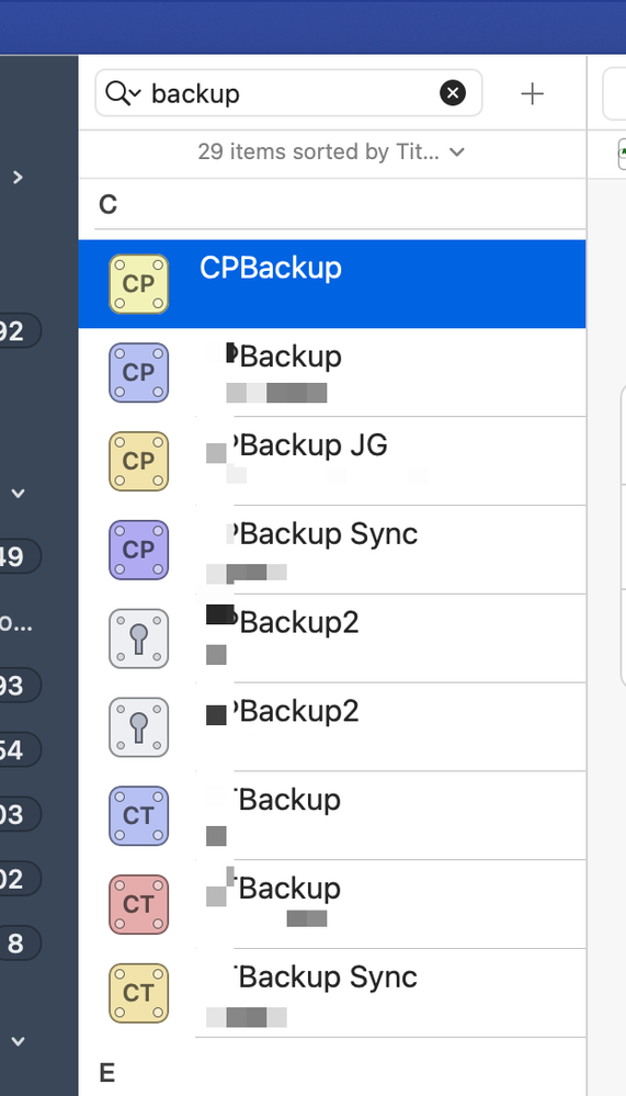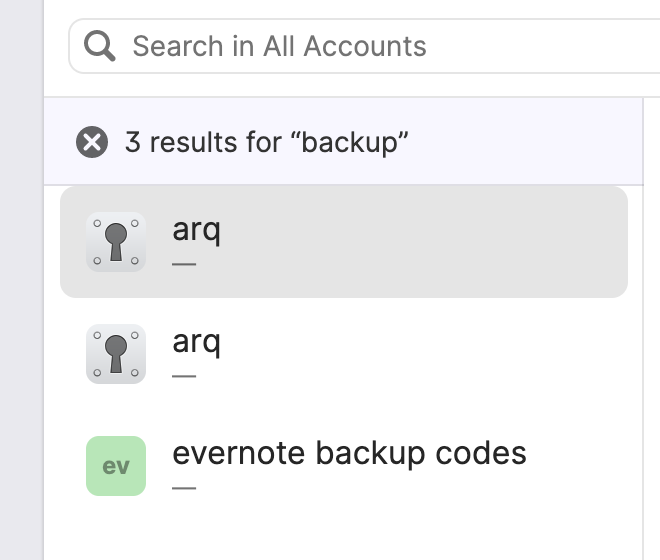 For example in 1P7 if I search for "backup" I get a list of the various logins for various NAS boxes (here's a few out of 20 or so):