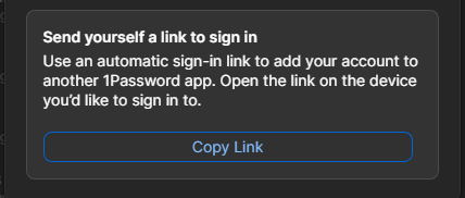 Anonymous4 years agoSend yourself a link not working The copy link button on the Setup New Device page is not working. It is not copying anything. 1Password Version: 8.2.2-23.BETA Extension Version: Not Provided OS Version: Not Provi...Show More