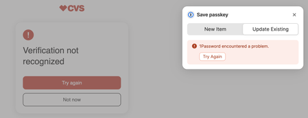 I tried setting up a Passkey on the CVS website using 1Password, but there is an error that says Try Again . This behavior is the same in Safari and Chrome.