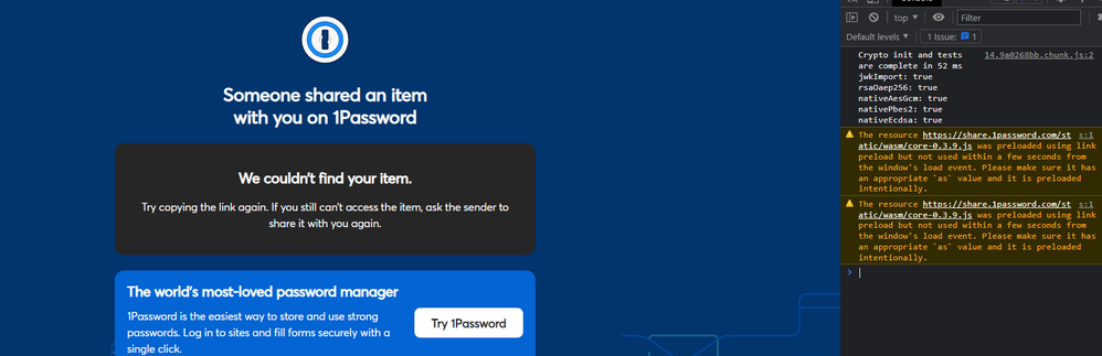 - A link to this thread: https://1password.community/discussion/138605/share-item-doesnt-work#latest