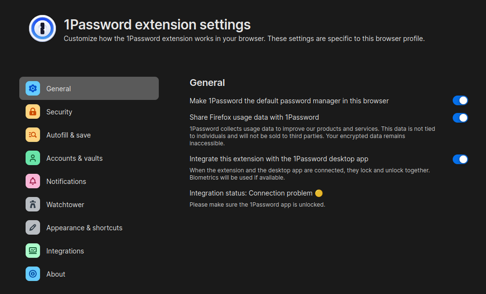 On my computer, the desktop app "Connect with 1Password in the browser" and browser extension "Integrate this extension with the 1Password desktop app" settings are turned on, but the setting doesn't work. The browser extension settings page says "Integration status: Connection problem":
