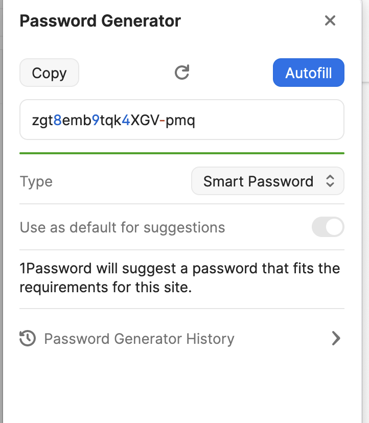 Good question! You can change the type of passwords that the password generator suggests by clicking on the 1Password icon in your browser's toolbar, clicking the menu button (it looks like a circle with three horizontal lines in it), and then clicking Password Generator. Once the generator is open, choose the settings that you'd like to use and make sure that Use as default for suggestions is turned on.