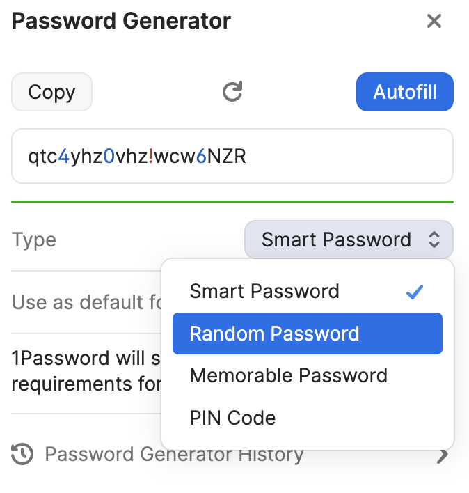 I recommend that you set "Type" to Smart Password since this will allow 1Password to generate strong and secure password that are automatically compatible with the websites that you use. You can read more about generating passwords here: Use the password generator to change and strengthen your passwords