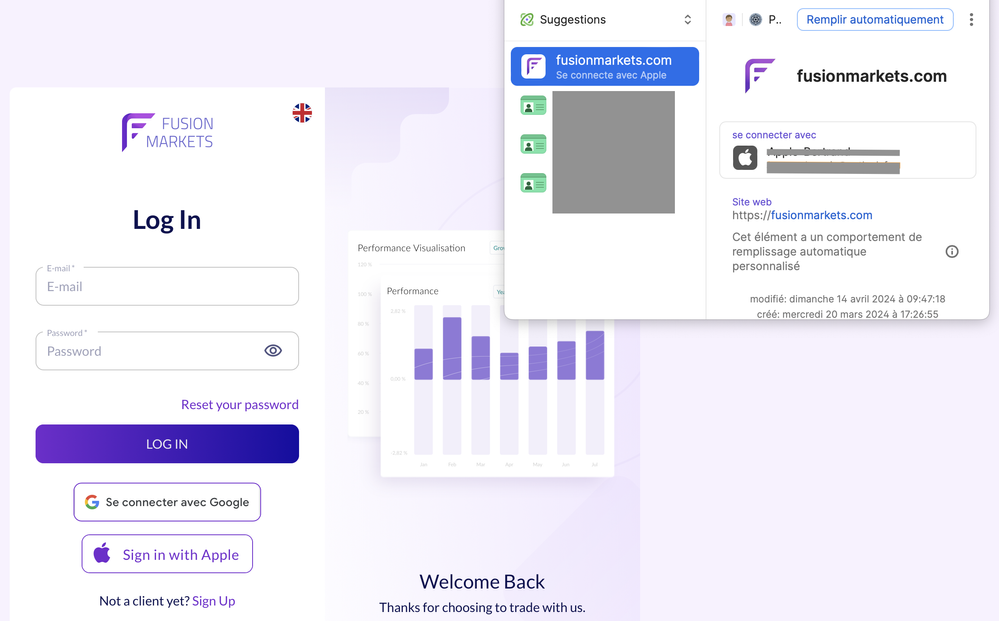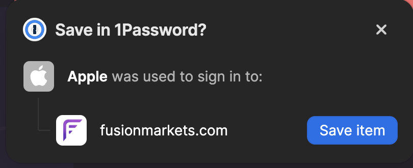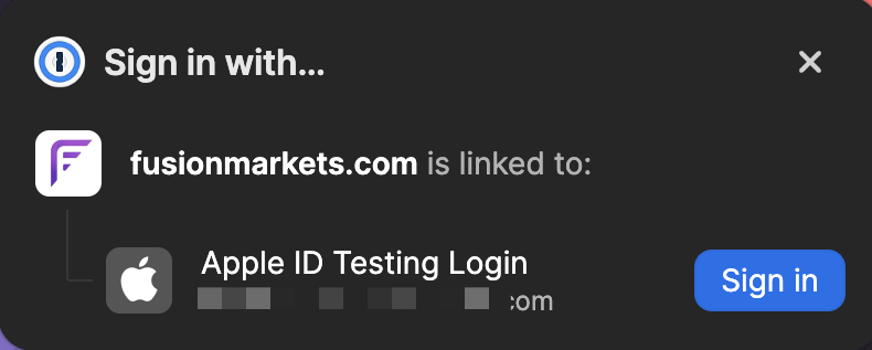 I'd also like to note that using a browser other than Safari, such as Google Chrome yields expected results and 1Password can be used to sign-in with an Apple ID on https://fusionmarkets.com/. Let me know if you have the chance to give this a try on your own Mac and whether you're able to sign in with your Apple ID using 1Password as expected.