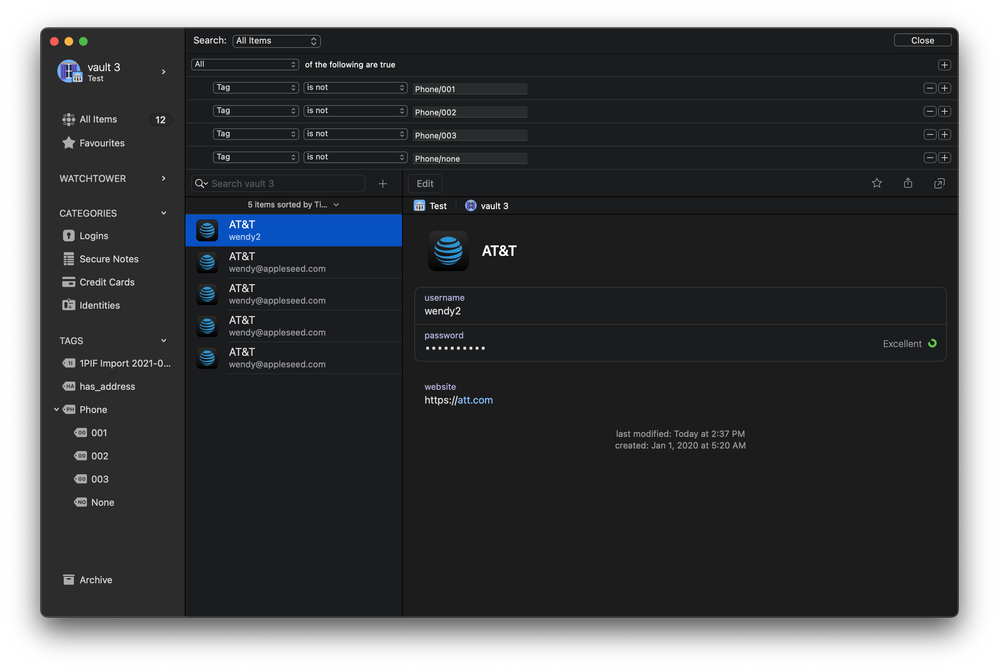 AND tag <> phone/noneThis SQL example is essentially what I've created in a Smart Folder to find records without a phone tag. If I can create an unsaved search query that results in the same output, I can migrate to 1PW membership. I don't mind "saving" the search parameters offline in a note somewhere. But the underlying search capability must be in the new platform somewhere to allow me to migrate.