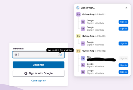 My company uses Okta for SSO. My understanding is that many work-related accounts are then supposed to work through a Google account logged in through Okta. E.g., to log into CultureAmp, it uses my G...