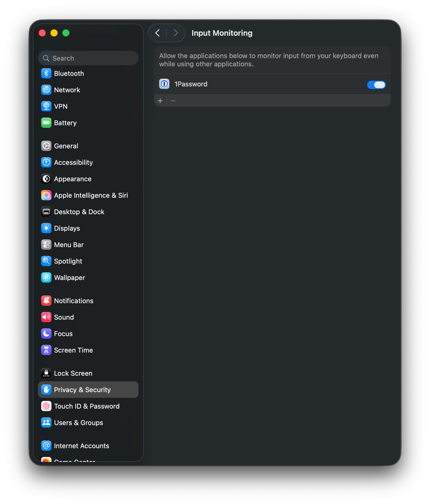 - CheesecakeNew ContributorSettings > Privacy & Security > Input Monitoring > (Add/Turn On "1Password")