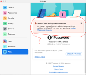 Today, after I updated 1Password for Mac to the latest version (8.10.38), I was greeted with this error message...