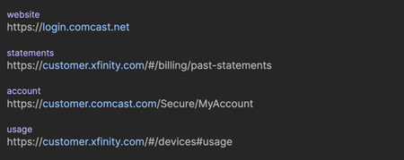 For my Comcast account, I have 4 websites that I use to pick a specific section of the website that I want to navigate to.