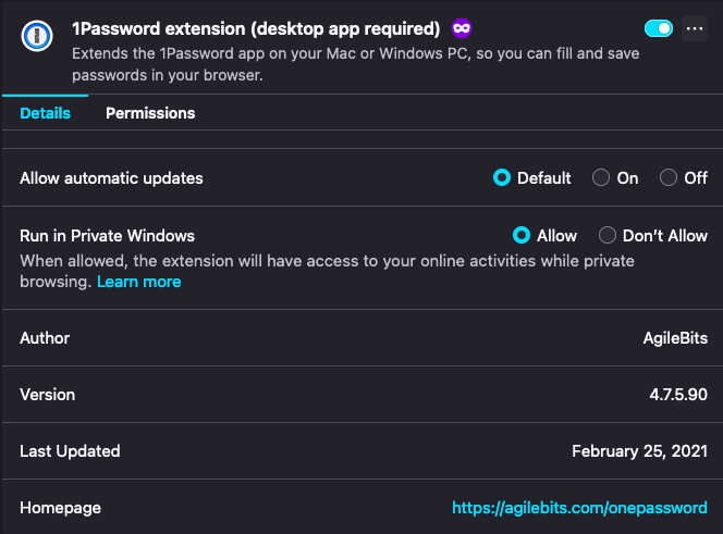 The difference between the two extensions I have going is that one "requires the desktop app" and belongs to AgileBits, and the other does not mention that requirement and is from 1Password. The one I am keeping enabled for now, which produces the desired behavior, is the former:
