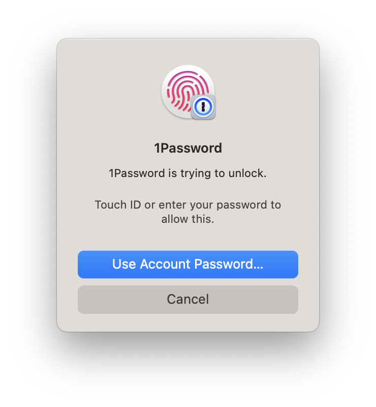 If you don't see this then can you restart your Mac and then try to open 1Password again. If you still don't see the Touch ID prompt appear then can you tell me a little more about how you're opening the 1Password app? Is it from the Dock, the menubar icon, or from within a browser?