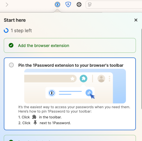 I've pinned it to the toolbar, done the tutorial, imported passwords from a CSV file and all is working perfectly. When I click 1 step left it shows the Pin to toolbar step and I can't select the circle