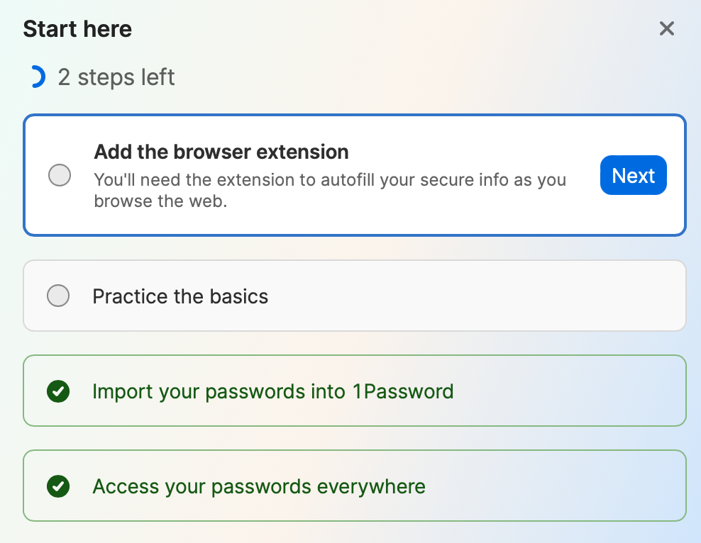 Long time user, family account. Click 1P extension icon in titlebar of browser window, popup's "start here" says I have 2 steps left. 'Add the browser extension' is the 1st step. Can't get rid of it.