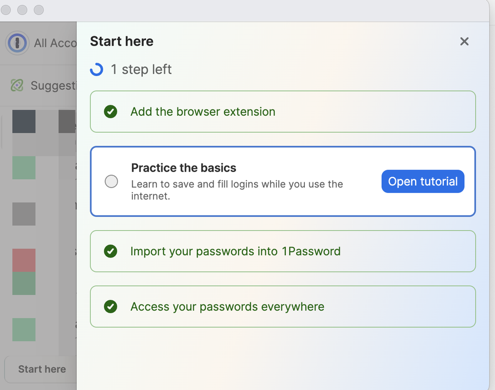 We've been using 1Password since version 3. Latest update is showing "Start here" prompts in both the app and browser extensions.