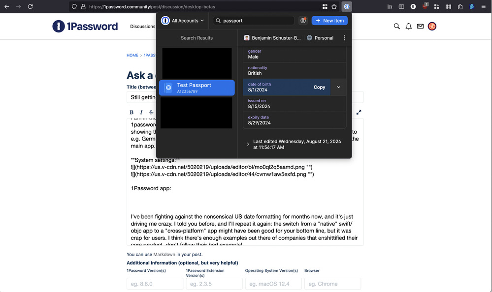 I'm sorry for the frustration. The date format not be respected in certain cases inside of the 1Password desktop app is a known issue that is known by our development team and is being worked on as I mentioned in your previous thread. I've let the team know that the issue continues to interrupt your workflow.