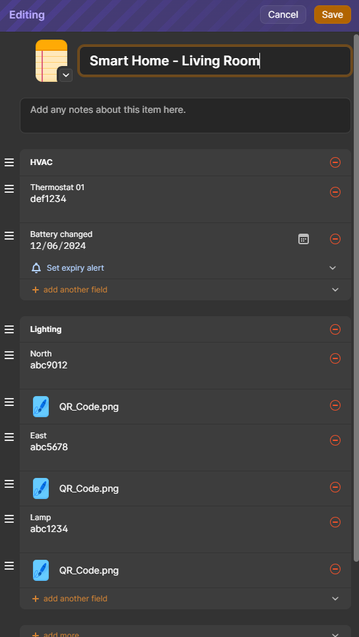 Does anyone have a suggestion to add the QR codes, the text codes and identifiable information like a location into 1password?