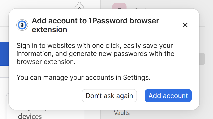 - Click Add account to add your 1Password account to the browser extension when prompted.