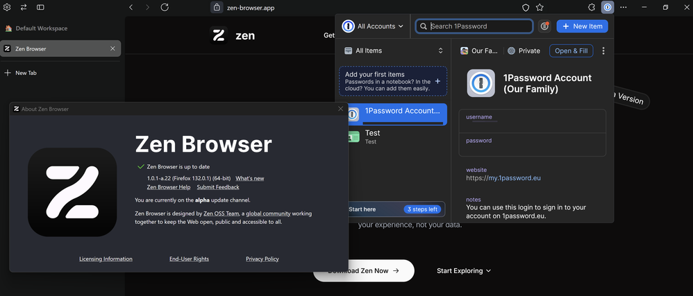 For the time being, you may still be able to use 1Password in Zen Browser on your Windows PC but you'll need to unlock it separately from the desktop app using your account password.-Dave