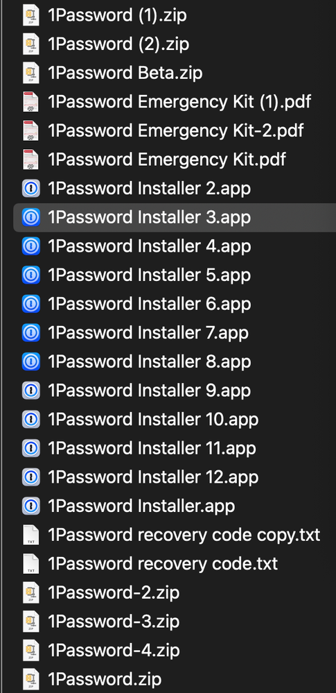 Dave, In the Downloads folder there are 11 1Password Installer x.app files that seem to be tied to the OnePasswordCoreLocalization file along with quite a few other 1Password files. I've taken a screen shot of them, can they be safely deleted without affecting 1Password?