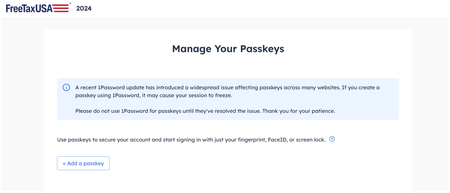 TaxfreeUSA.com notice says 1Password Passkeys have a bug.