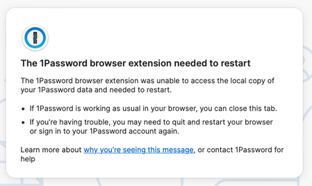 I'm sorry for the trouble, here is some more information about the error message you are seeing: If you see "The 1Password browser extension needed to restart".
