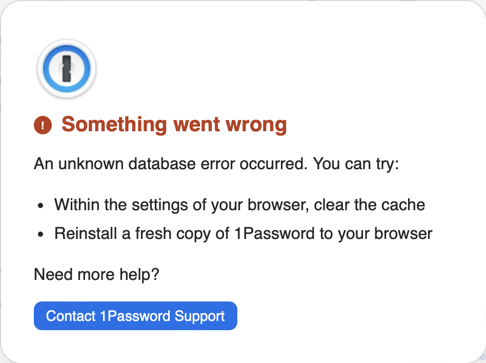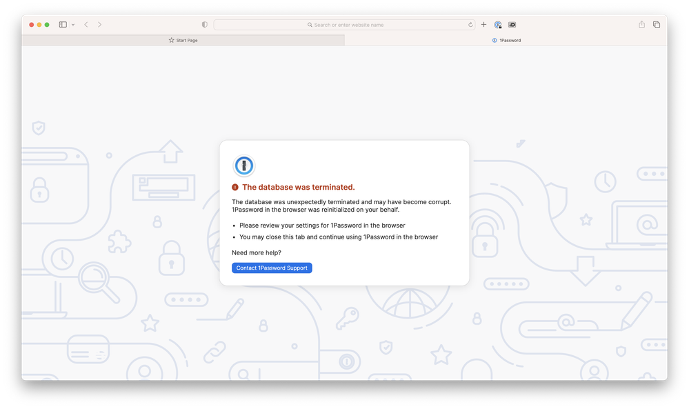 The database was unexpectedly terminated and may have become corrupt. 1Password in the browser was reinitialized on your behalf. Please review your settings for 1Password in the browser You may close this tab and continue using 1Password in the browser.Im not sure if it's specific to a website but I don't think so. I am using a Mac Desktop running Ventura 13.3.1 and 1Password version 8.10.4 and Safari version 16.4. All current I believe. What can I do?