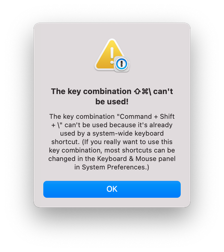 2 years agoI ran into the same issue as well today. I had removed the ⌘\ shortcut to try something out and then wanted to re-assign it, but no luck. This is on an M2 MacBook Air. 1Password complains that the shortcut is already assigned, but that's not the case, as I can assign it within another app, and it's not showing up inside System Preferences. I'd appreciate if there was an actual solution to this problem.