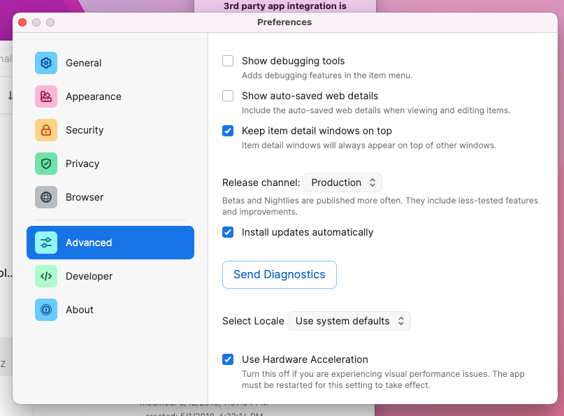 When I start 1Password I get a message about third party integration (screenshot below) but the option to allow this is not present in the place suggested (screenshot below).