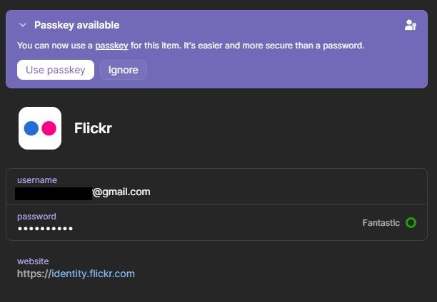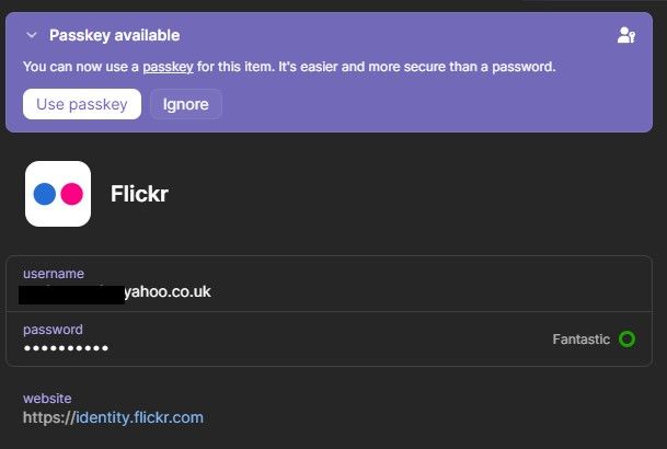 I have two flickr accounts. flickr does not appear on the passkey directory website. flickr https://techcrunch.com/2019/03/04/after-more-than-10-years-flickr-frees-its-login-system-from-yahoo/?guccounter=1&guce_referrer=aHR0cHM6Ly93d3cuc3RhcnRwYWdlLmNvbS8&guce_referrer_sig=AQAAAAdr8Ye8wRR5bviLpcank9B9v3KpQY0GS4OsD4TG5DSOMez9KEH7RjxdLhdck9E9KwRPpQJ_q4ObSYfOHReCMSscB0dbb5y9-4vWgmeuS90lTMZoIS37wFk3OC0MOsMsZhBpktvl0L9reffsqi6u5v8Zdb8xic1GwjIyiM8OmDtB tied to a Yahoo mail account but not anymore. As you can see from the screenshots one of my accounts uses a yahoo email the other a gmail email both use the same URL. For what ever reason (like the pharmacy issue in a previous post above) Watchtower insists that passkeys are available when they simply ARE NOT!