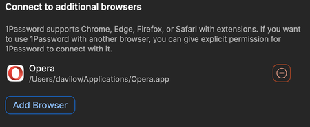 P.S. On the other hand, on your screenshot it is installed into /Applicaitons (no tilde), so you probably wanted to say that Opera should be in the global apps folder in order to be able to connect with the 1Pass desktop app. Now that might be the cause, and if so - it should be fixed. Many apps, including browsers, can be installed to user local folder instead of the global one, because many users nowadays don't have admin rights, which is actually a good thing from the security perspective. 1Password should be able to work with locally installed browsers the same way as with globally installed ones.
