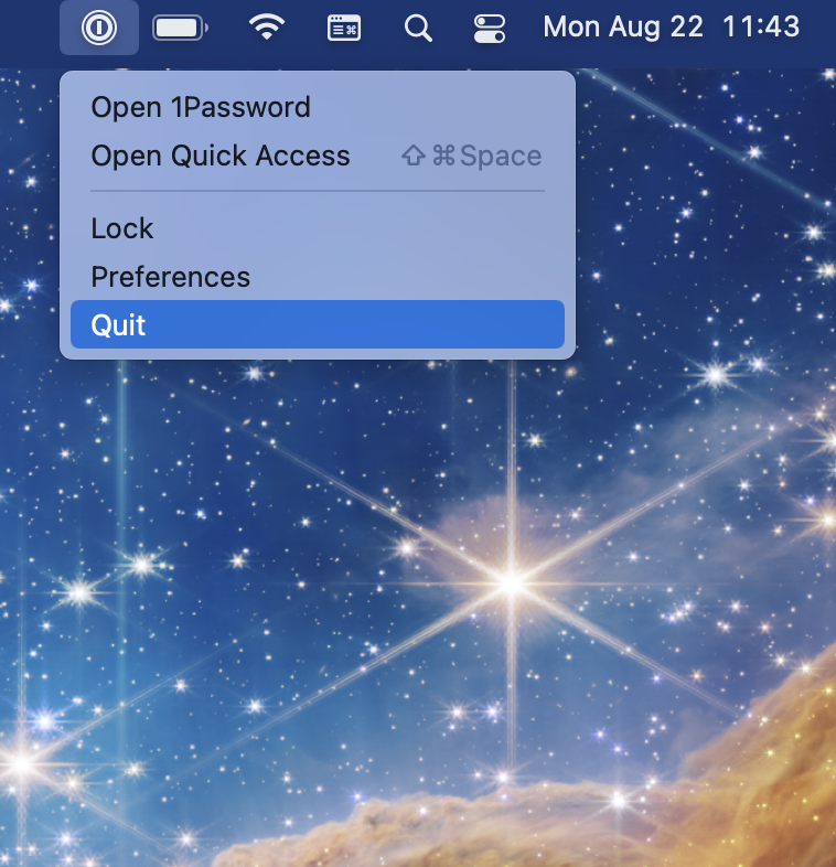 If you want to continue to have access to 1Password from the menu bar, but be sure 1Password is closed completely, be sure to select "Quit" from the Menu Bar icon on the right. This is the main way to fully close 1Password when this setting is enabled: