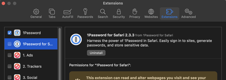 Why are there two Safari extensions? I have both installed but only one active. Sometimes I get nagged to activate the other. I will say that the one reading "1Password for Safari" has this tremendou...