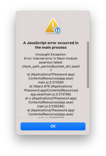 After updating to 1Password 8, the application will no longer launch properly but instead shows an error saying that "A JavaScript error occurred in the main process" (screenshot shown above)...