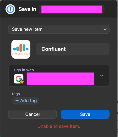 When trying to save a "via-Google" login in Chrome, I keep getting an error message "Unable to save item".