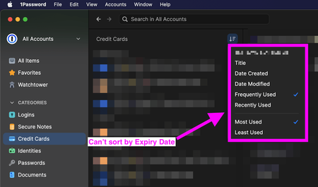 In 1Password 7, I found it helpful to be able to sort my credit cards by expiry date, which allowed me to keep track of when they would expire.