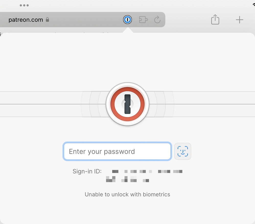 Whenever the 1Password extension for Safari is locked and I click on the toolbar icon to unlock it, it seems like I should be able to unlock it with Face ID because there's the little Face ID icon the same as opening the main app, but whenever I click it, I get an error saying "Unable to unlock with biometrics" and I have no choice but to unlock with the master password.