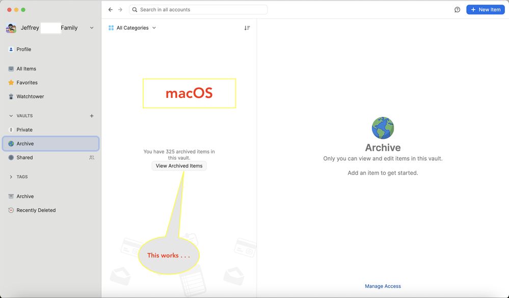 If I delete the vault named "Archive", which is the one that I believe I created many months ago, would not the Items still be stored in the 1PW Archive that is just above Recently Deleted? I believe all of the Items in vault named "Archive" are Login Items. I did some cleanup and the count is down to 321.