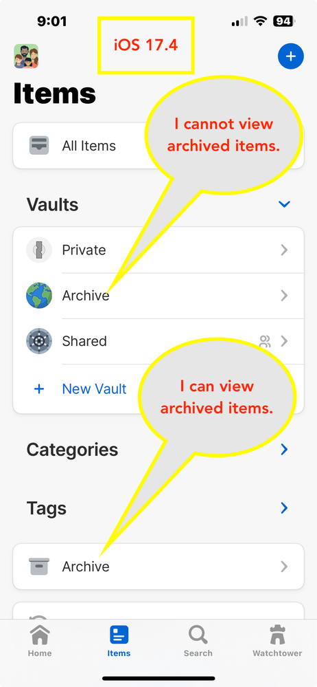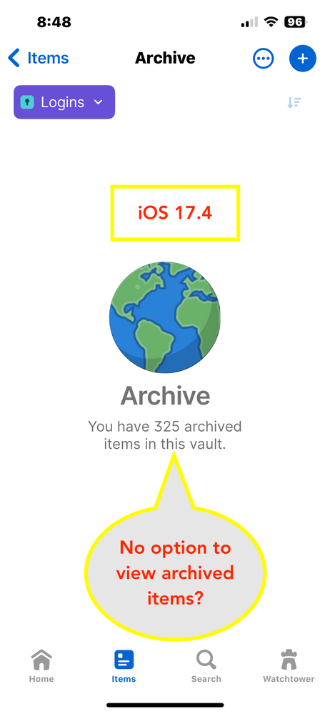 Unable to "View Archived Items" in 1PW for iOS 17.4