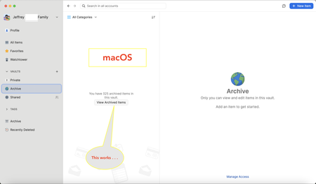 Unable to "View Archived Items" in 1PW for iOS 17.4