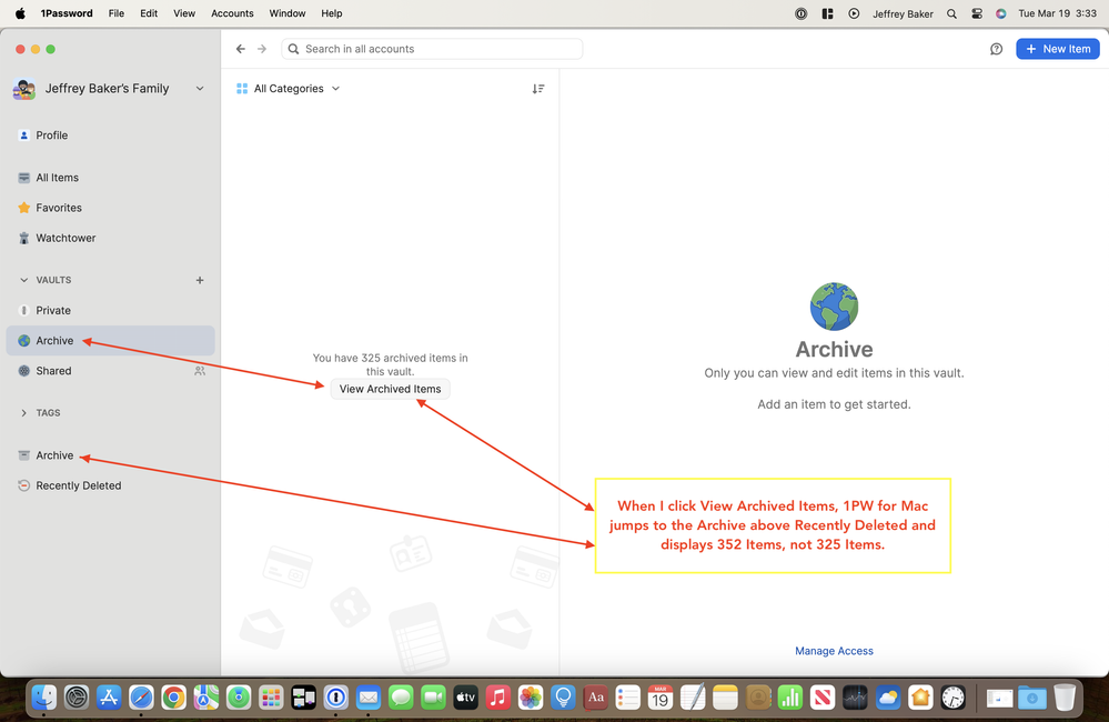 If I now understand how 1PW for Mac works, I did not need to create an Archive. If so, my preference is to keep things simple and get rid of the Archive (without deleting any Items) that I did not need to create in first place. I don't think I have archived any Shared Items so all archived Items are my Private Items. I did notice, however, that the 325 count of Items in my manually created Archive does not equal the count of Items in the Archive above Recently Deleted. Am I correct that this is the Archive that 1PW creates when a user elects to archive an Item?