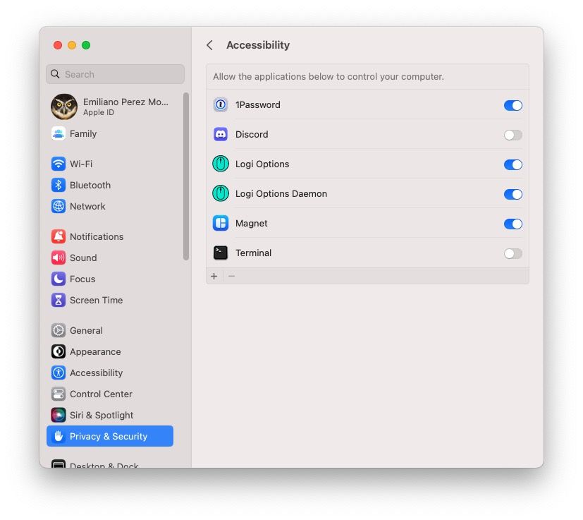 I would like to point out that 1Password wasn't in this Accessibility menu when initially downloaded, I had to add it my self.