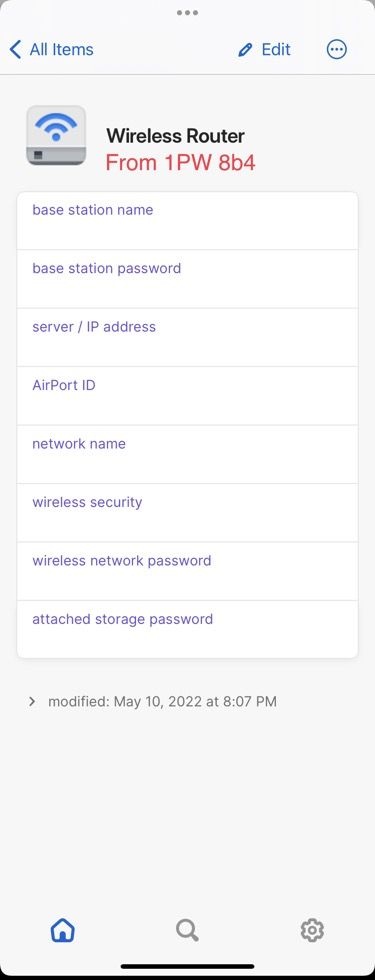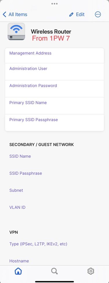 In other words, when I add for example a new Wireless Router item, the template for which I have heavily modified, none of my customizations appear — instead, it creates a new item based off the original Agilebits version of the template. To illustrate, here's a screenshot of what I get in 1PW 7 vs 1PW 8 after hitting New > Wireless Router: