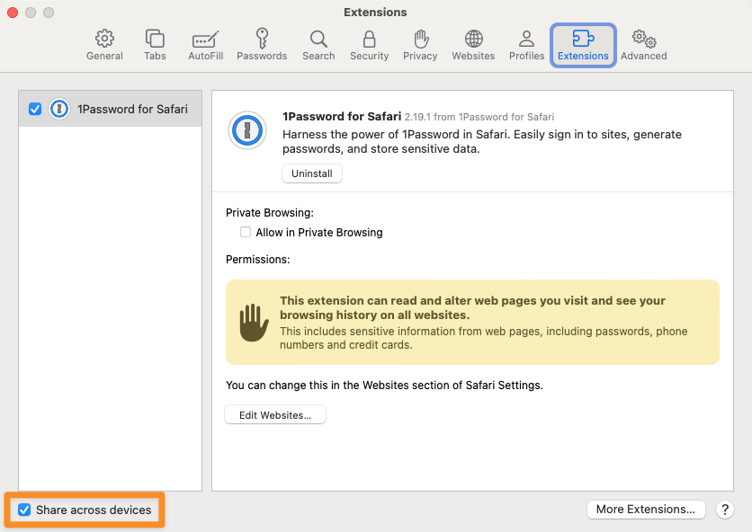I want to use the 1Password Safari Extension, but only on MacOS, not on iOS (I want to use the app on iOS). Is this possible? I haven't found a way in either the iOS or MacOS settings for Safari or 1Password. If I enable the extension on my Mac, it enables it on my phone too.